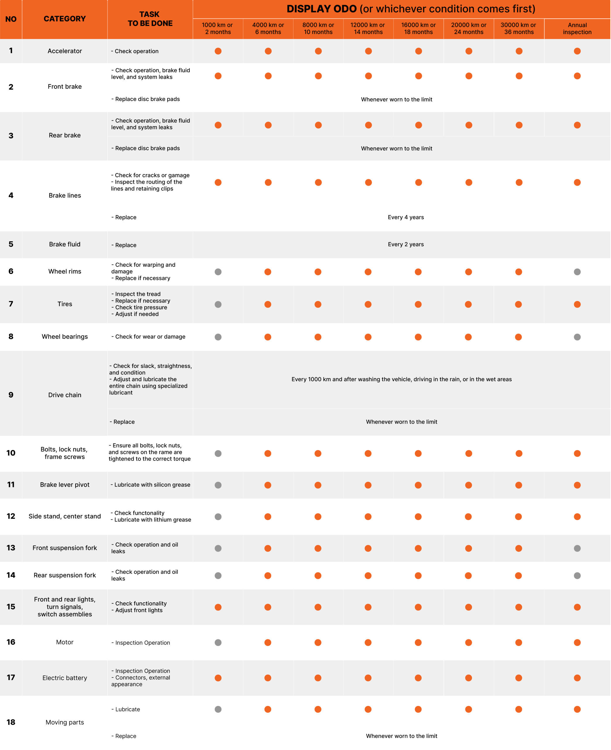 Bring your vehicle to Dat Bike to have the brake fluid replaced at the specified service intervals. General maintenance table (section 4.1.2) . The brake piston oil seals and brake lines should also be replaced at specified intervals or whenever damaged or leaking.