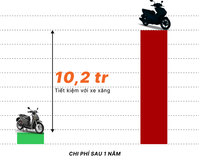 Calculation based on: Average gasoline price 23k/L, 1L of gasoline can travel 45km, average electricity price 1800 VND/kWh, Oil change 200,000 VND/every 2000km, maintenance cost ~1,000,000/year/gasoline car and ~300,000 VND/year/electric bike